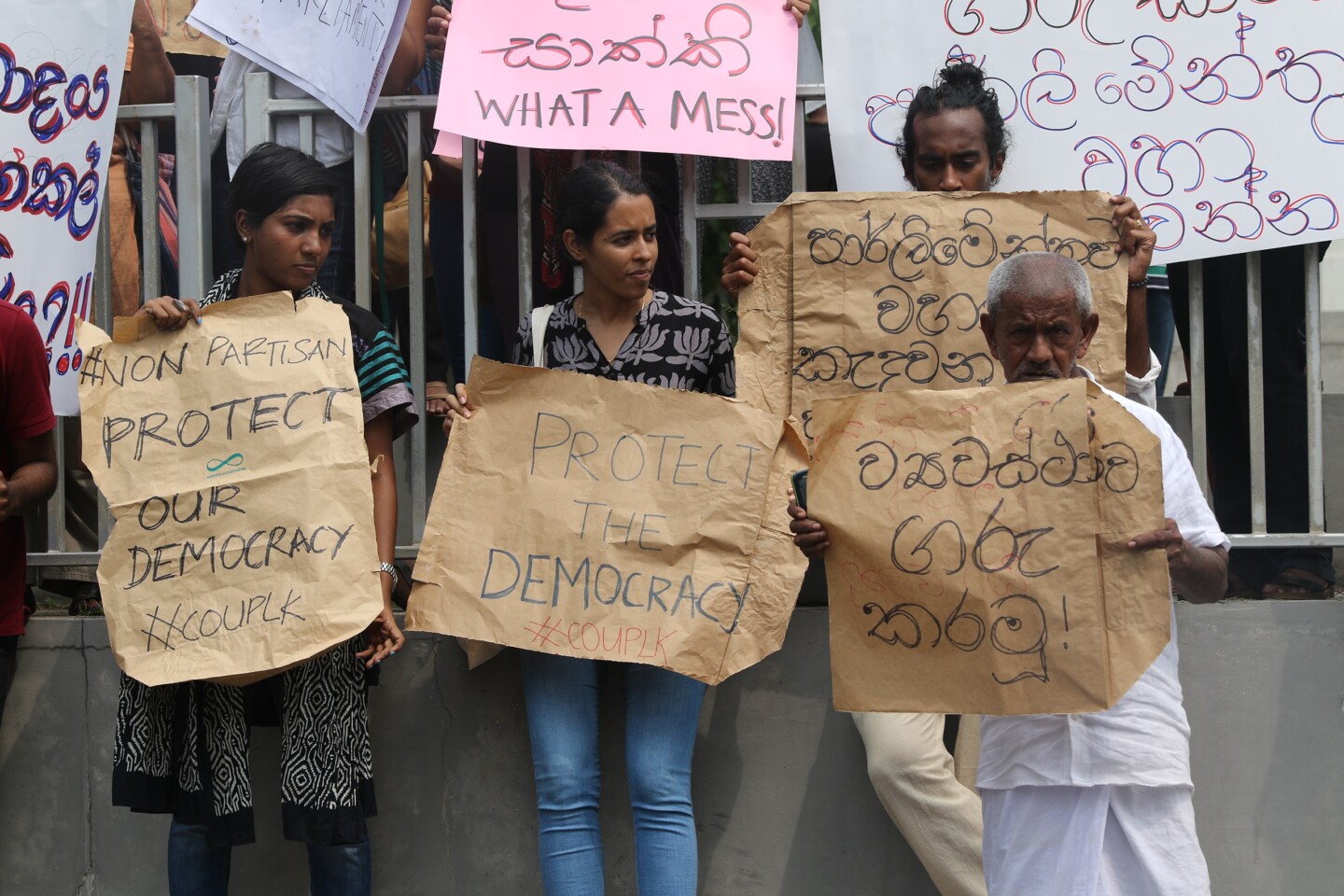 Seit dem Beginn der politischen Krise haben verschiedene Gruppen in der Hauptstadt Colombo demonstriert. Die Zivilgesellschaft protestiert seit dem 30. Oktober jeden Tag und fordert die Einhaltung der Verfassung von allen Seiten, ohne eine Partei zu unterstützen. Die "United National Party" (UNP) um den legitimem Ministerpräsidenten Ranil Wickramasinghe organisierte am 29. Oktober einen Massenprotest. Die UNP sprach selbst von 100’000 Teilnehmer*innen, die Polizei hingegen meinte, es seien nur 25’000 Teilnehmer*innen gewesen. Am 6. November führten Zehntausende von Rajapaksa-Anhänger*innen einen noch grösseren Protest durch. Die Polizei schätzte die Teilnehmerzahl auf 120’000, das staatliche Fernsehen gar auf 200’000. Ausserdem protestierten am 15. November nochmals die UNP-Anhänger auf den Strassen Colombos gegen die illegitime Regierung.